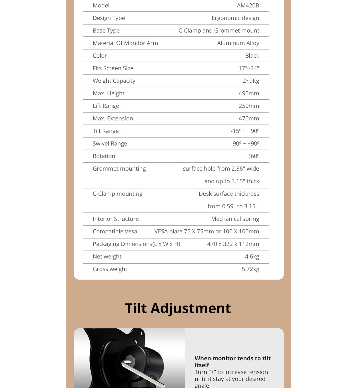 Aluminum Alloy Structure Durable Mechanical Spring Two Mounting Options Full Range of Motion Optimized Tilting Structure Cable Management