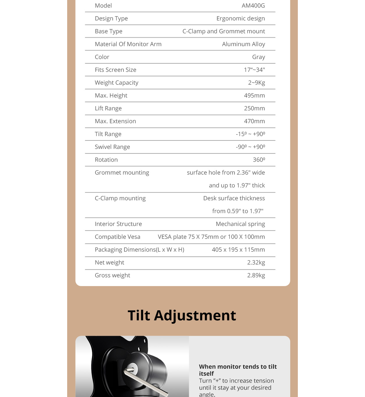 Aluminum Alloy Structure Durable Mechanical Spring Two Mounting Options Full Range of Motion Optimized Tilting Structure Cable Management