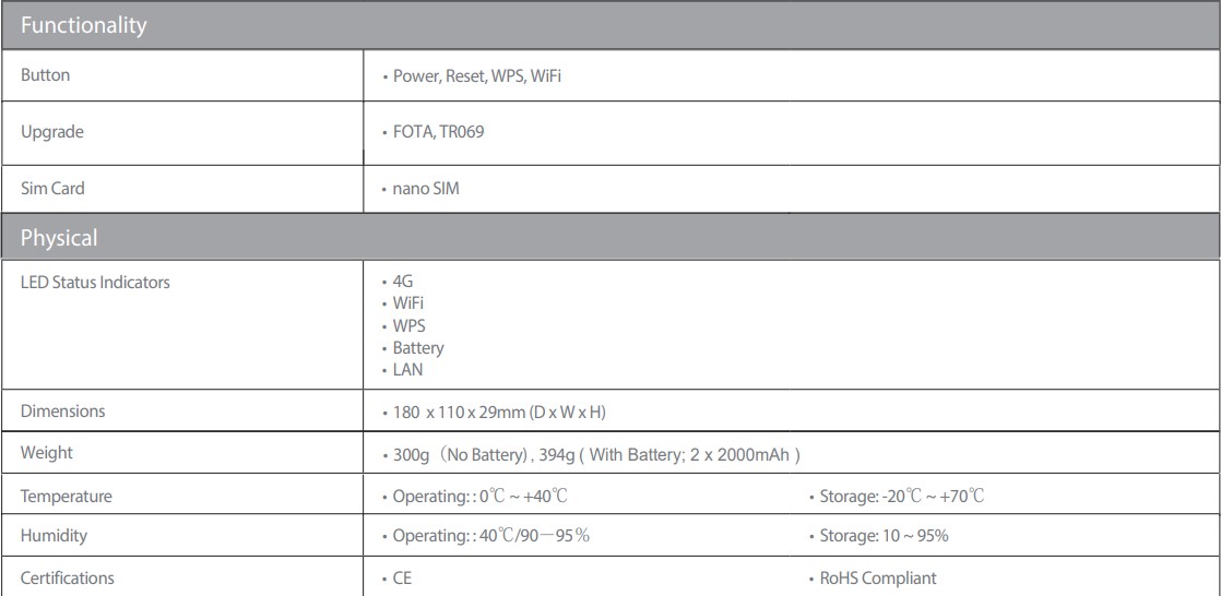 Device Interfaces • 1 x 10/100/1000 Gigabit Ethernet WAN/LAN port