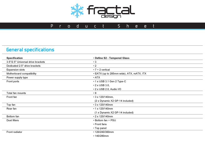Key features ● Seamless, scratch-resistant tempered glass side panel ● Optimized for silence with high-density industrial dampening on side, top and front panels ● Full USB 3.1 Gen 2 Type-C with support for fast charging and up to 10Gbps transfer speeds ● Nine fan positions with intuitive layout and clear airflow paths for massive cooling capacity ● Extensive water cooling support with room for radiators up to 420mm in the top, 360 mm in the front, and 280 mm in the base ● Full-length power supply shroud hides excess cables for a clean interior and features a removable panel for installation of larger front radiators ● Third generation ModuVent™ technology gives users a choice between a soundproof steel cover or filtered multi-fan ventilation setup in the top panel ● Easy-to-clean high airflow nylon filters on the front, top, and base with full PSU coverage and front access for convenience ● Nexus+ Smart Hub offers superior control of six additional case fans and three PWM devices via your motherboard ● Three Fractal Design Dynamic X2 GP-14 140 mm fans come pre-installed with dual intakes and rear exhaust for optimal airflow right out of the box ● Concealed drive mounts for up to three 3.5" HDDs leave ample forward space for reservoirs and advanced water cooling setups ● Customizable 2.5” storage solution with two brackets and a choice of four locations to hide drives beneath the motherboard tray or display them prominently on top of the PSU shroud ● Sleek anodized aluminum front panel with sound absorbent inlay Package contents ● Define S2 - Tempered Glass computer case ● User manual ● Accessory box