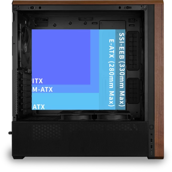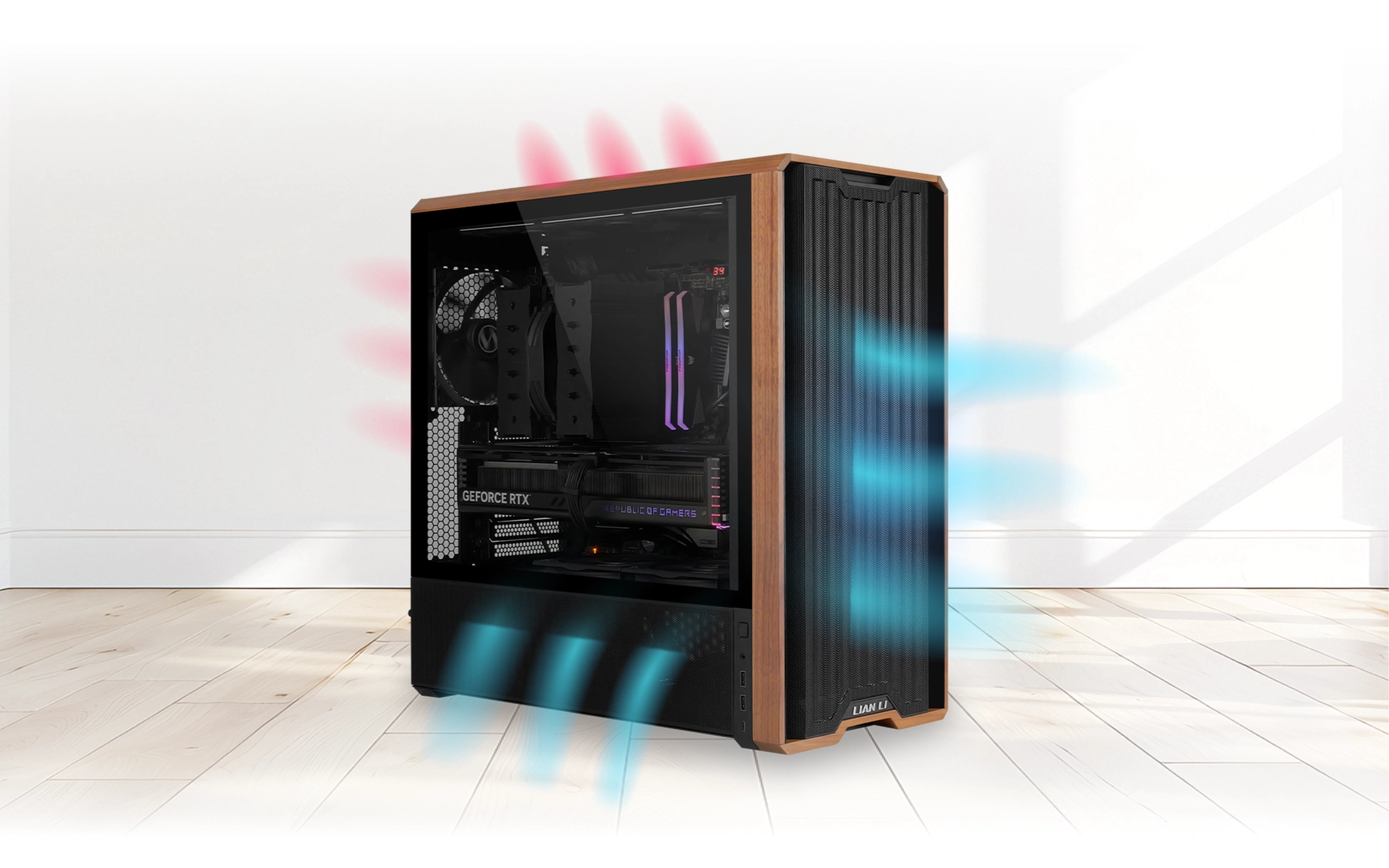 The LANCOOL 217 is thoughtfully engineered to blend natural wooden aesthetics with high-performance airflow. It features a front panel that pairs finely perforated mesh with a wooden frame to maintain an organic look while allowing for unrestricted airflow.