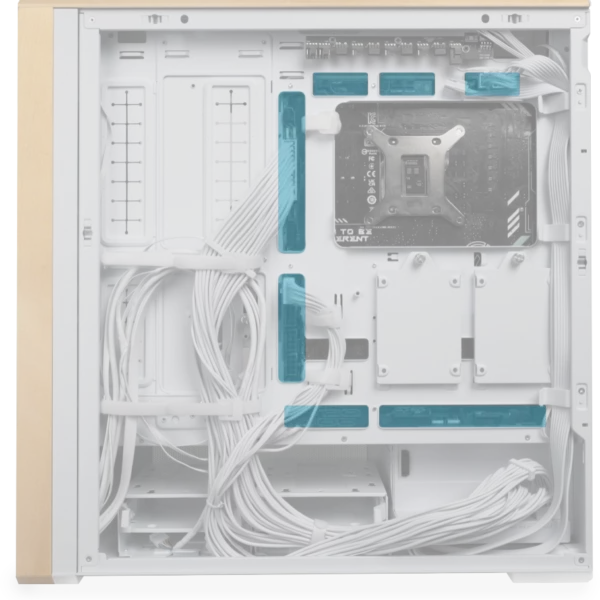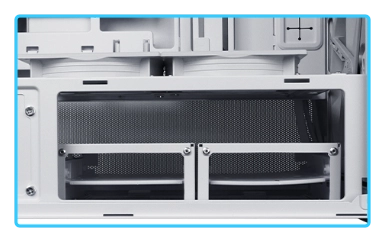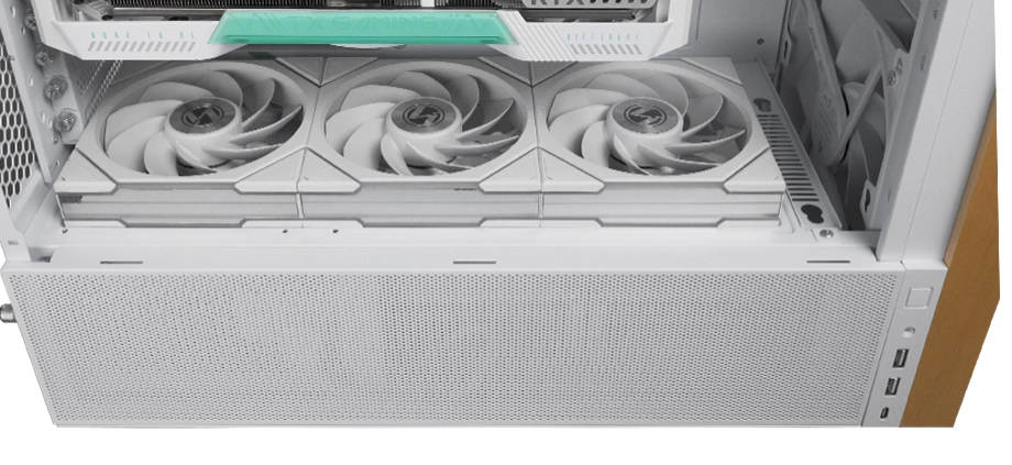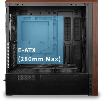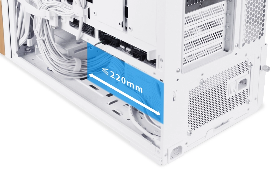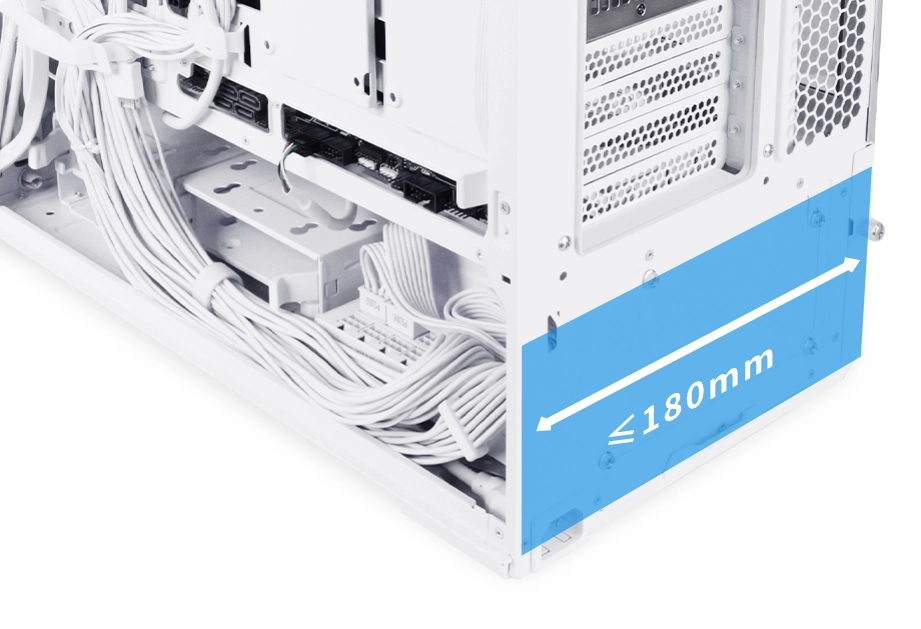 When the PSU is turned 90° with the connectors facing the right side, it supports compact PSU up to 180mm. This optimizes cable routing space and allows the fan to directly cool the PSU for improved cooling efficiency. Users can also move the two included bottom fans under the bracket for a hidden look, making the build cleaner and more organized.