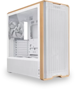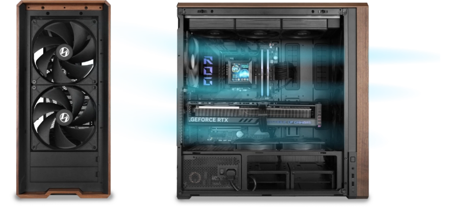 The LANCOOL 217 is a mid-tower case that combines innovative cooling design with real wood accents. It comes pre-installed with five fans, delivering optimized airflow right out of the box. A flexible PSU mounting design makes cable management easier. Available in Black with dark wood accents or White with light wood, it blends natural beauty with high-performance capability.