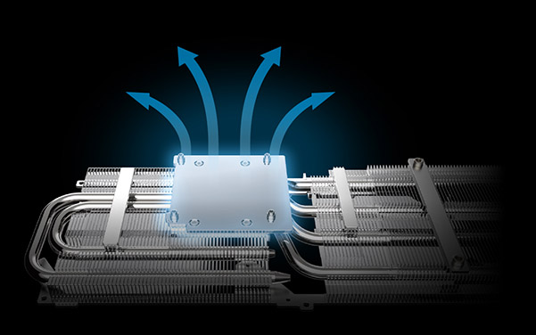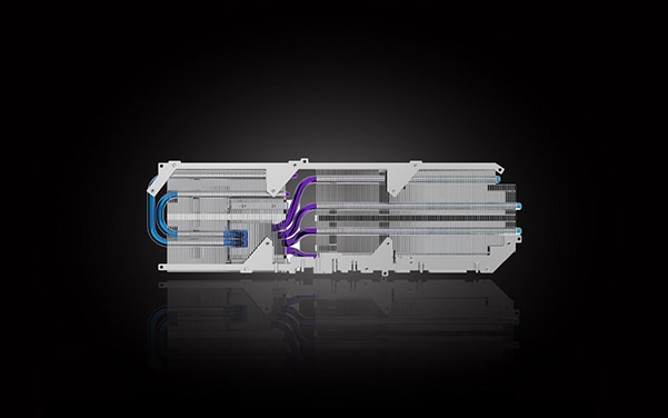 Four 6φ nickel-plated copper heatpipes are aligned above the PCB, optimizing heat transfer from the GPU and VRAM to the cooling array.