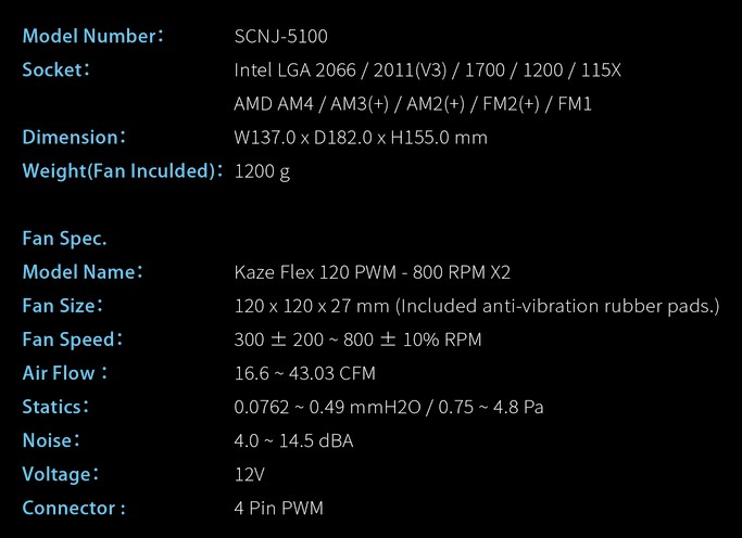 The Ninja 5 Rev.B pays special attention to silent operation without compromising performance. Included two Kaze Flex 120 (only 800RPM) fans as push-pull configuration makes Ninja 5 Rev.B a great solution for silent PC. The award-winning Kaze Flex fans use Sealed Precision Fluid Dynamic Bearings for a long lifespan of 120,000 hours (MTTF).