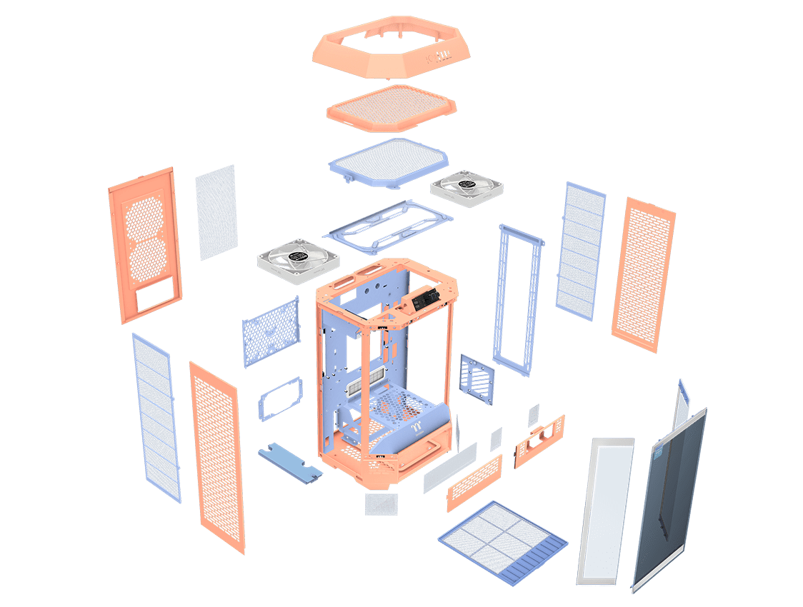 As a new edition of The Tower Series, The Tower 300 Peach Fuzz inherits the classic vertical case design but comes in an octagonal prism shape. It has amazing hardware compatibility, accommodating a 4090 GPU, a standard-sized power supply up to 220mm, and a 420mm AIO radiator. What's more, it can accommodate up to eight 120mm/140mm fans on the top, back, PSU cover and right side fan bracket. If you want to make The Tower 300 Peach Fuzz more visually appealing, you can purchase the separately sold 3.9" LCD Screen Kit and Chassis Stand Kit to upgrade the build; the former to display real-time component information and the latter for a unique view with a special horizontal placement.